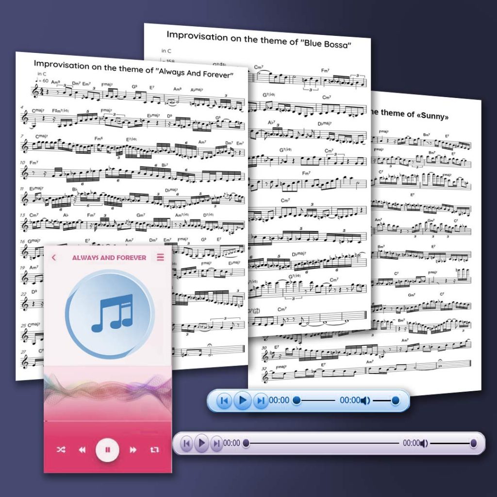 All materials on the site are completely free, and you can download sheet music for all improvisations and backing tracks directly from each page of the website.